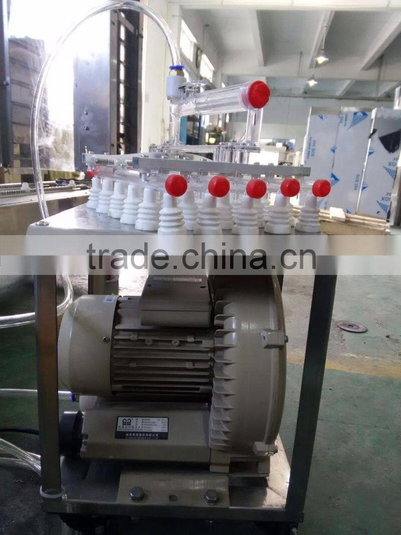 First, Eggs are sucked onto the roller of egg cleaner by a vacuum egg lifter (1*6=6 eggs each suck). The vacuum egg lifter is run by a motor but lift up and down by hand, that helps workers to load eggs onto the egg machine more easily.