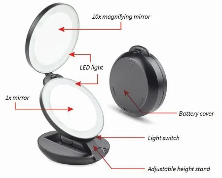LED mirror perfect for travel, work or home use.