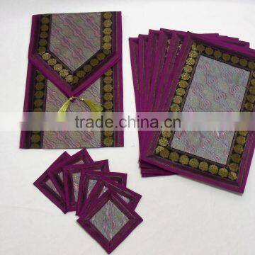 Pink Color Indian Table Runner with 6 Placemat & 6 Coaster. Made from Banarasi Silk, Size: 62"x 16" inches Beautiful Table Runner from the holy town of Varanasi in brocade work. Brocades are textiles woven with warp and weft threads of different colors and often of different materials. The Benaras (Varanasi) brocades are woven in silk, with profuse use of metal threads on the pallavs (end pieces). Whether doing a romantic dinner for two, a buffet for the family or the gang from work, a well turned out table in colorful brocade silk table runners is the beginning of a successful party.