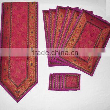Pink Color Indian Table Runner with 6 Placemat & 6 Coaster. Made from Banarasi Silk, Size: 62"x 16" inches Beautiful Table Runner from the holy town of Varanasi in brocade work. Brocades are textiles woven with warp and weft threads of different colors and often of different materials. The Benaras (Varanasi) brocades are woven in silk, with profuse use of metal threads on the pallavs (end pieces). Whether doing a romantic dinner for two, a buffet for the family or the gang from work, a well turned out table in colorful brocade silk table runners is the beginning of a successful party.