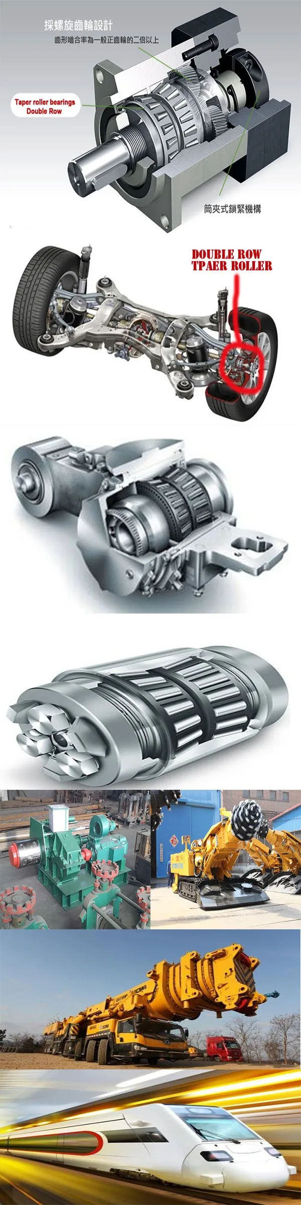 Double Row taper roller bearings are used in automobiles hub wheel,and high speed railway,gear box,lifting equipment,tunnel boring machine mining machinery.