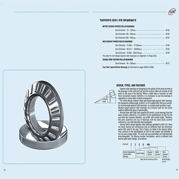 Those bearings are generally used to support combined load mainly consisting of radial load. Their cups are separable for easy assembling. During mounting and using, radial clearance and axial clearance can be adjusted and preload mounting can be made.