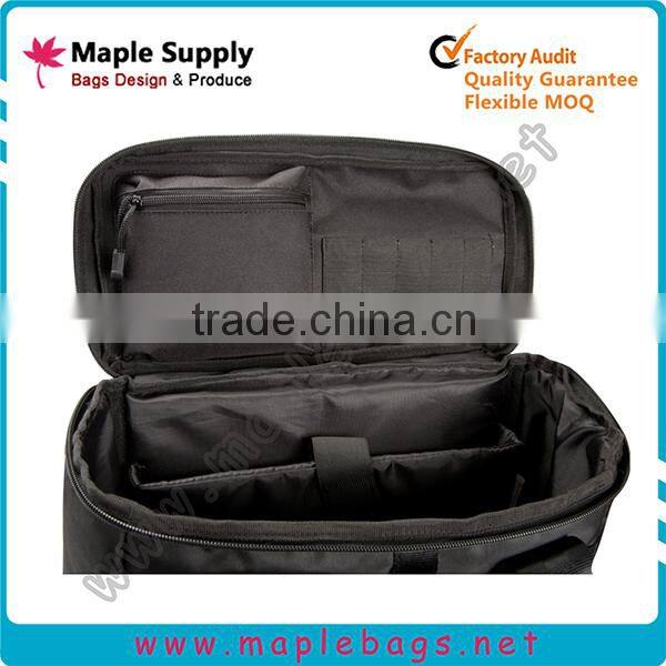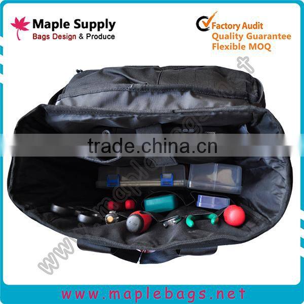 1. 1680D polyester material 2. 210D lining 3. high quality webbing 4. inner with laptop compartment and smaller slots for tools 5. can be used for hiking or camping backpack |
