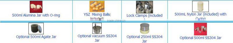 Tank (Jar) | Four 500ml Nylon Jars are included 32 ZrO2 (YSZ) balls with various sizes are included (8 balls per jar). If extra YSZ balls are needed please click the pic below to order. Lock Clamps are included for easy jar securing Various jars are available as optional (click products option to order) Four jar holders can accommodate jar size upto 107mm O.D x 112mm H O-ring can be inserted between the lid and jar for wet grinding (ID:90mm, OD:104mm) |