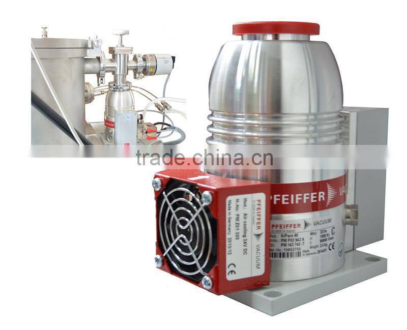 Vacuum Pump Station | 1.High speed turbo vacuum pump system (made in Germany) is directly installed on the vacuum chamber for max. vacuum level 2.Heavy duty dual stage mechanical pump is connected to turbo pump for faster pump speed 3.Mobile pump station is included and the compact sputtering coater can be put on top of station 4.Max. vacuum level: 10^-6 torr with chamber baking |