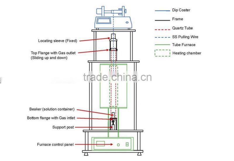 It is designed for R&D Lab to prepare various optical or epitaxial films from liquid solution under a controlled temperature and atmosphere environment. Dipping rate, pulling rate, dwell time and life cycle can be setup by touch screen. Solution is located at the bottom of the sealed tube at room temperature, and sample can go through a hot zone up to 800oC (to protect the stainless steel wire and sample clamp) under various gas atmosphere or vacuum for achieving high quality epitaxial films. Also this furnace can be modified into a Bridgman vertical furnace , Please read applicationnote below