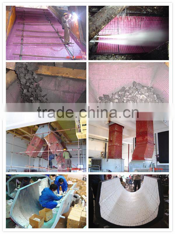 The alumina ceramic rubber lining chute are a ideal wear resistance material for delivering the coal,sand,mine,slag ,ash ,dregs in Pneumatic ,hydraulic material handling and feeding system.