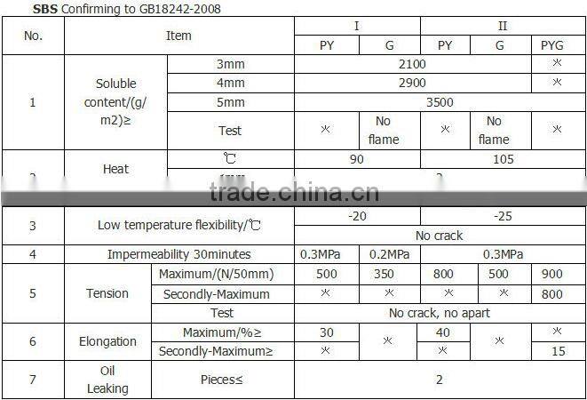 SBS(Styrene Butadiene Styrene) modified bitumen membrane is made by saturating the base in bitumen, or thermoplastic elastomer (such as styrene butadiene-SBS), reinforced with polyester or fiberglass, finishing the upward facewith fine sands, mineral slates (or grains) or polythene membrane, etc.
