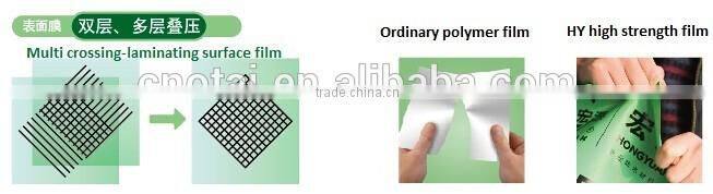 It's surface is coated with apple green HDPE mask, which is our patent product. This strong cross film is HDPE film by cross-laminated composite technology, with same transverse and longitudinal elongation, no deformation, aesthetic and more reliable waterproof effect.