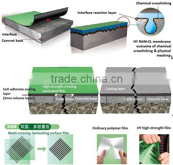 The RAM-CL rapid response sticky strong cross film self-adhesive waterproofing membrane is composed of a cross laminated high density polyethylene (HDPE) film, excellent polymer self-adhesive rubber bitumen, with dimensional stability, excellent thermal stability, anti-ultraviolet and bidirectional tearing resistance.
