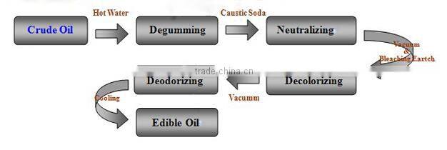 Crude oil -- Degumming and Deacidification -- Decolorization --Deodorization -- Filtering --Refined cooking oil.