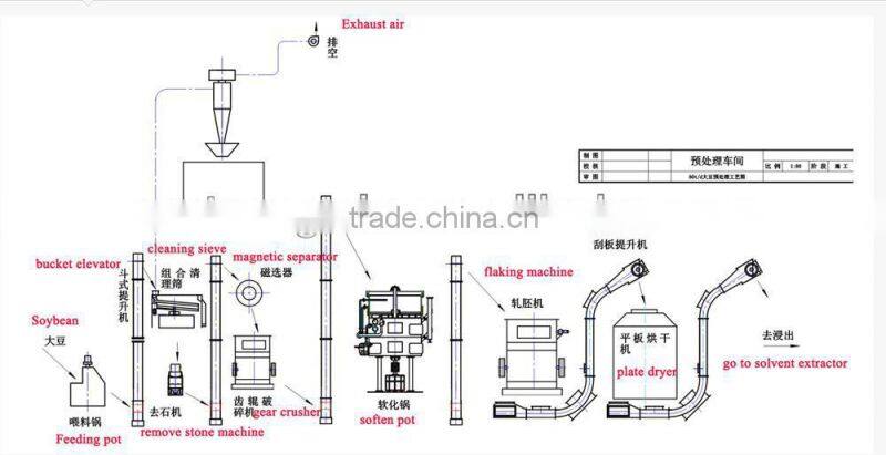 Oil seeds -- Magnetic box-- Cleaning Sieve-- Crusher -- Flaking roll -- Cooker -- Oil prepressing -- Cakes -- Solvent Extraction workshop