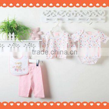 including 1 pc of bib, 1 pair of socks, 1 pc of romper, 1 pc of T-shirt and 1 pc of trousers.Baby’s 5 pc suit set including 1 pc of bib, 1 pc of romper, 1 pc of T-shirt and 1 pc of trousers and 1 pair of socks.