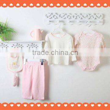 including 1 pc of bib, 1 pair of socks, 1 pc of romper, 1 pc of T-shirt and 1 pc of trousers.Baby’s 5 pc suit set including 1 pc of bib, 1 pc of romper, 1 pc of T-shirt and 1 pc of trousers and 1 pair of socks.