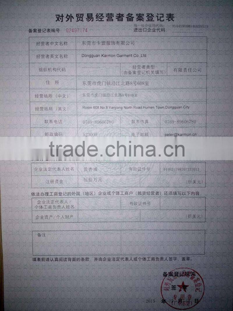 Karmon( K&M ) garment factory integrated high quality design, production and logistics resources, the specialty is engaged in the women's clothing production and marketing work, with design team, production team, modern production equipment.