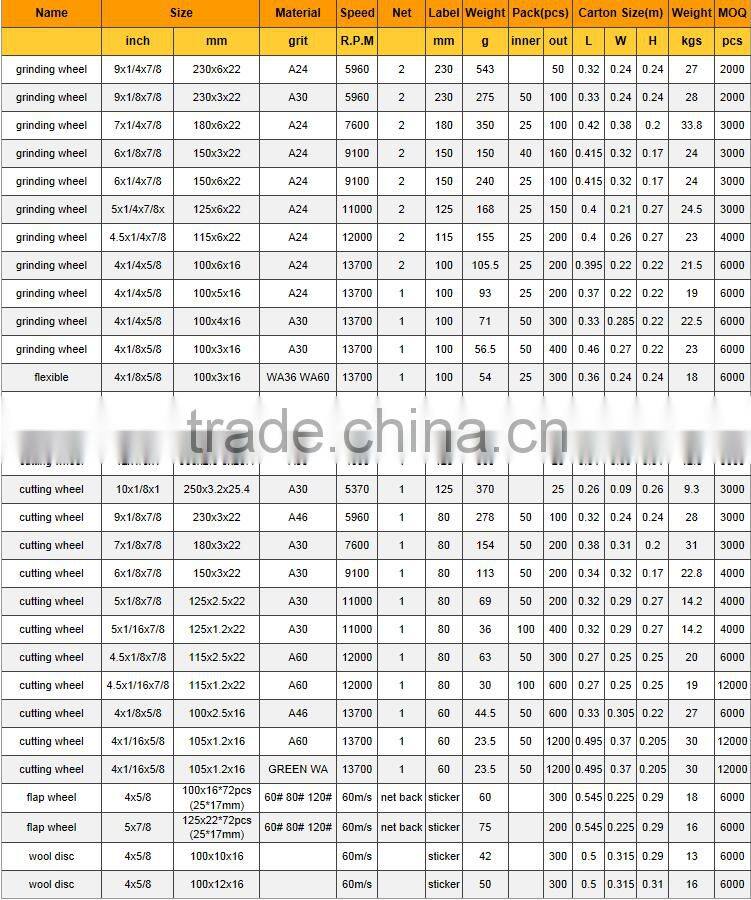 Part of the Product Dimension Table of Abrasive Flap Disc