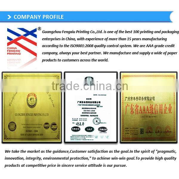 A:We are the Manufactory specialized in printing&pacaging more than 15 years,have more than 280 works,in Guangzhou,Guangdong province,China.Our factory have passed IS09001:2008,BV Factory Audit.