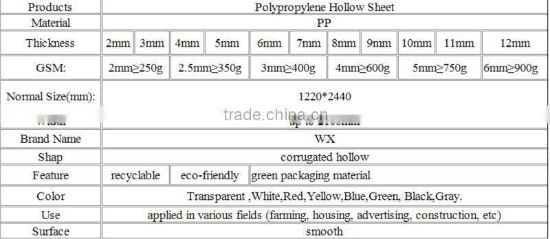 Our company specialized production of PP hollow plate, according to customer demand for production two to six mm thickness, wide any ordinary insulating board, antistatic hollow plate, corrugated board turnover box. PP hollow plate also called wantong board is a kind of green environmental protection material, generally USES the environmental pollution can recycle thermoplastic polypropylene (PP), polyethylene (HDPE) resin and all kinds of accessories production and become, which has high transparency, qualitative light, impact resistance, sound insulation, heat insulation, etc, it is a high-tech, comprehensive performance is extremely outstanding, energy conservation and environmental protection plastic board. Is used extensively at home and abroad, and gradually replacing part of the corrugated packaging materials, the most common are turnover box, can remove combination box, packing box in clapboard and finished product, the background for advertising, stationery materials, industrial packaging, product shock resistance etc!