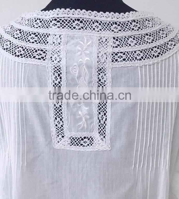 a) Heavy embroidery at yoke and hem b) Cotton lace around neckline and armhole |