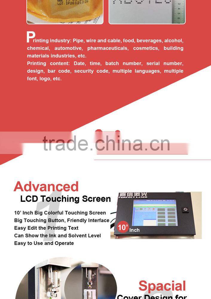 Perfect Laser’s bottle label inkjet printer can be widely applied in the industries of printing on pipe, wire, cable, food, beverages, alcohol, chemical, automotive, pharmaceuticals, cosmetics, building materials etc. for the printing of date, serial number, label, character, logo, and batch number.
