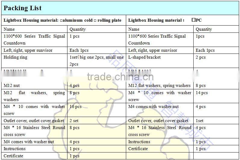 « Red Countdown: 14*39 pcs of LED, single brightness: 4360 ~ 6300mcd, wavelength: 625 ± 5nm, L/R/U/D viewing angle: 30 °, power: ≤9W.