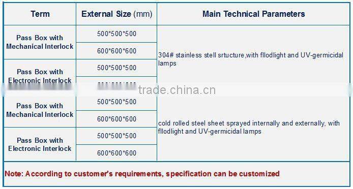 Pass box is an auxiliary equipment for clean room,mainly used for passing small items between the clean zones,the clean zone and non-clean zone in order to reduce the number of opening room door,to reduce the pollution of the clean room to a minimum