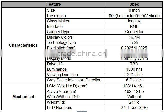 8.0" TFT LCD High Resolution 800*600 High Luminance 1000 Nits RGB Interface Touch Tft Lcd Display Module