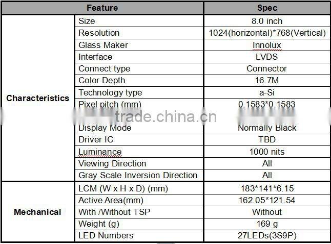 ODM/OEM TFT LCD 8.0 Inch 1024*768 Resolution Touch Tft Lcd Display Module With High Brightness for Car DVD Player