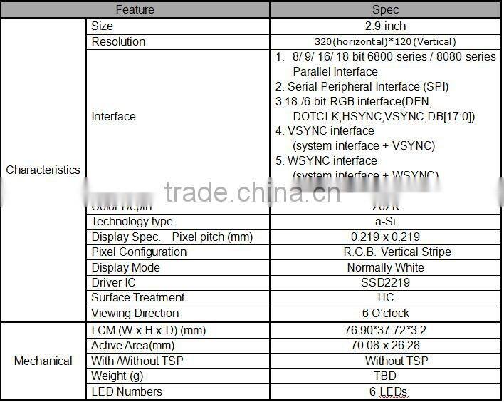 Factory Price TFT LCD 2.9 Inch 320*120 Bar Type Tft Lcd