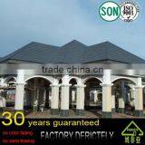 Chengfeiya stone coated roof tile shapes and advanced sheet metal and coating technology to improve toughness,is a beautiful and practical high-tech roof system.Without cement mortar,steel tile with screws and self adheive strengrh,avoiding the pollution of the roof ,reducing constuction dust.This tile is suitable for steel roof struction,wood struction,cast concrete structure,to avoid doing waterproof,easy installation,reducing the consumption of resources,can complete in a short time into laying.