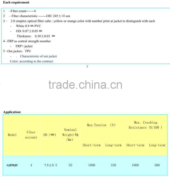 The fibers,125μm,are positioned in a loose tube made of a high modulus plastic.The tubes are filled with a water-resistant filling compound.The tube is wrapped with a layer of PSP longitudinally.Between the PSP and the loose tube water-blocking material is applied to keep the cable compact and watertight. Two parallel steel wires are placed at the two sides of the steel tape.The cable is completed with a polyethylene (PE) sheath.