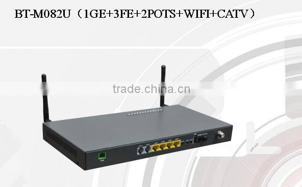 BT-M082U(1GE+3FE+2POTS+WIFI+CATV)is an EPON user terminal,which meets the SOHO broadband access ,FTTH broadband speed ,FFTH/FTTD of cable-television operator.The equipment based on mature, stable, cost-effective Gigabit EPON technology combines Gigabit Ethernet switching technology, WIFI and high-quality VoIP technology. It has high reliability, ease of administration and good QOS. The technology performance meets the IEEE802.3ah, China Telecom EPON equipment technical requirements (V2.1) specification requirements.