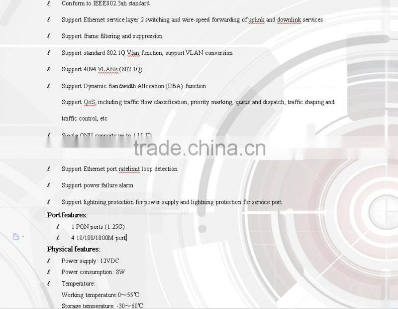 G031U-B type ONU products fully comply with IEEE 802.3-2005 and the China Telecom EPON device technical specification (V2.1). It is operative, manageable and maintainable at telecommunication level, and can provide high speed data service for customers. It has a PON uplink port that connects to office end apparatus through optical fiber