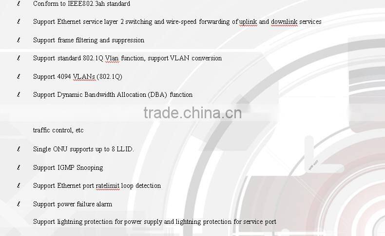 BT-G010U-N type ONU products fully comply with IEEE 802.3ah. It is operative, manageable and maintainable at telecommunication level, and can provide high speed data service for customers. It has a PON uplink port that connects to office end apparatus through optical fiber