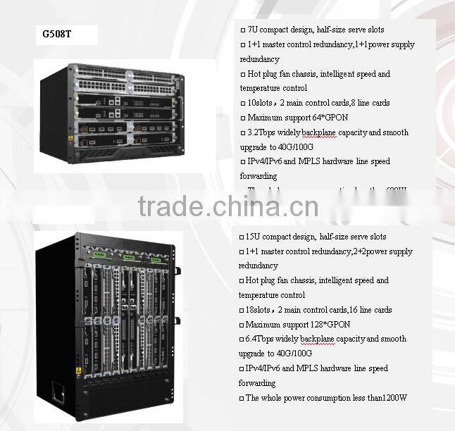 Satisfy ITU-T standard TR-101 compliant solution for FTTx OLT applications High splitter rate, each PON port supports 128*ONU ,512*T-CONT Maximum transmission distance of 60KM Support uplink FEC, downlink FEC(Forward Error Correction) Periodically update AES encryption ONU identifier authentication :SN/PASSWD/SN+PASSWD Bandwidth allocation mechanism 4 types of T-CONT bandwidth Static Bandwidth Allocation Dynamic Bandwidth Allocation Fiber link inspection 4 types of TYPE A/B/C/D line protection mechanism GPON feature parameter 4096 port-IDs per GPON MAC (Downstream and Upstream) 1024 Allow-IDs per GPON MAC (Upstream) |