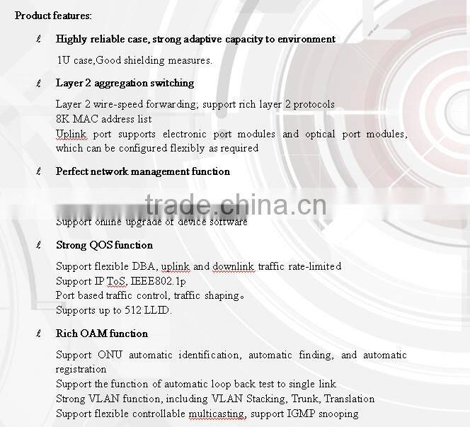 BT-M120T-A is a small scale office end OLT device of FTTX telecommunication level independently researched and developed by BT Company; it conforms to IEEE802.3-2005 standard; it can provide user with access to comprehensive services such as broadband, voice, IPTV and CATV.