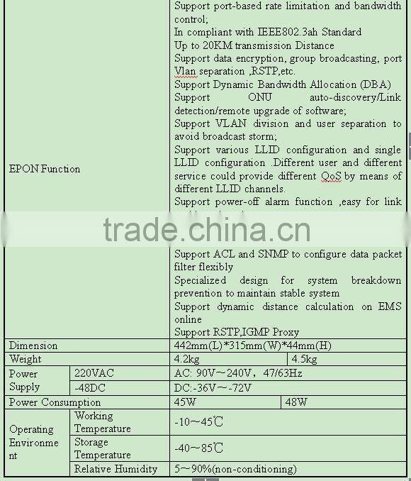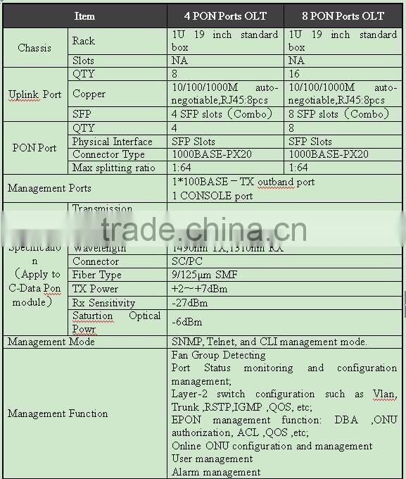 8PON Ports 1U Pizza-Box OLT provides 8GE(copper) and 8SFP slots Combo interface for uplink, and 8 EPON ports for downstream. It can support 256 ONU under 1:64 splitter ratio