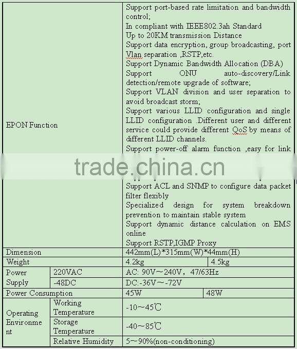 4PON Ports 1U Pizza-Box OLT provides 4GE(copper) and 4SFP slots Combo interface for uplink, and 4 EPON ports for downstream. It can support 256 ONU under 1:64 splitter ratio