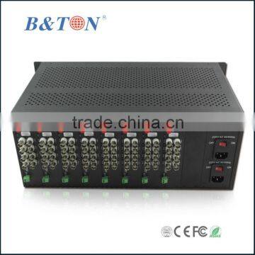 | Rackmounted chassis is a centralized and economical equipment of gathering video/data modules together. Bton-2U Chassis can accommodate a combination of up to 16 pieces of video modules and video/data modules. AC110/220V Switch Mode Power Supply(SMPS) design is employed to make module working independently possible without interference from one power shutdown and other modules' failure within the chassis. High reliability and stability of each module are achieved. |