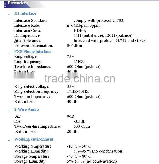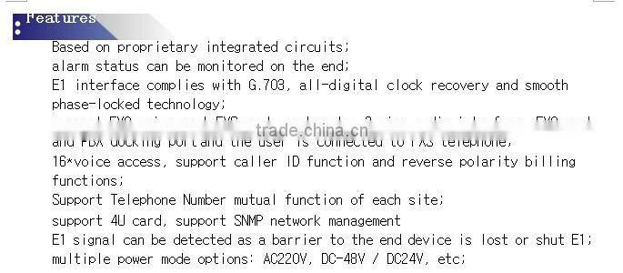 This device is desktop type, there 4U rack card type, which provides telephone outputs 16, Equipment electrical part for the whole digital circuits, machine reliability, stability, low power consumption, high integration, small size, easy installation and maintenance. Many customers are telecommunications operators E1 leased lines used in computer networking, this equipment can be rented at the E1 line opened a few road phone, you can make free calls between headquarters and branch offices of this.