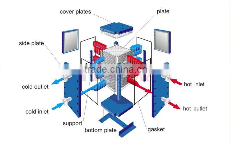 4) Applies range wide: the plates and the pressure plate both using welding structure, it can work well for temperature ≤ 300 ℃, pressure ≤ 4.0 Mpa or the media has corrosion of occasions and flammable. easy burst, toxic media and the high environment requirements security , and liquid media of cooling, warming, evaporation, Therefore, Both the advantages of plate heat exchanger, with high temperature & pressure.