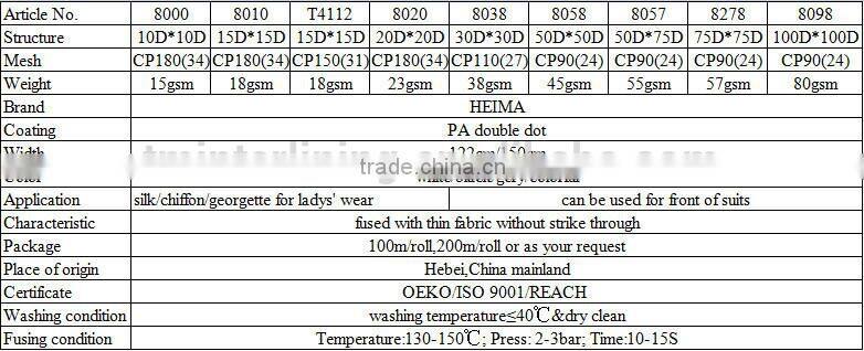 | 10.Product Characteristic: | a.Soft and plump hand feeling.Moderate elasticity in warp and weft direction,following the fabric to change.It is helpful fo the apparels'shape and style. b.Garment washed at 40-80 centigrade degree and enzyme washed interlining can be produced. c.Lower and wider fusing range,better hand feeling after ironing.