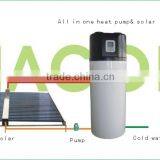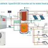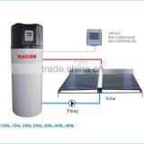 Our heat pump can heating with solar , which will be more energy-saving ,and our heat pump with a solar temp. difference control that when solar temp. is 2C higher the the tank temp., the solar will work automatically to make the most to use the solar water .