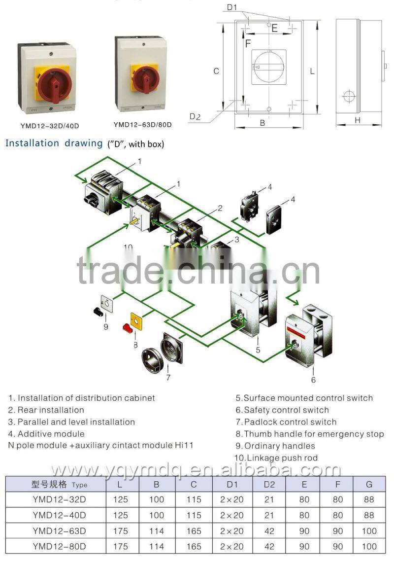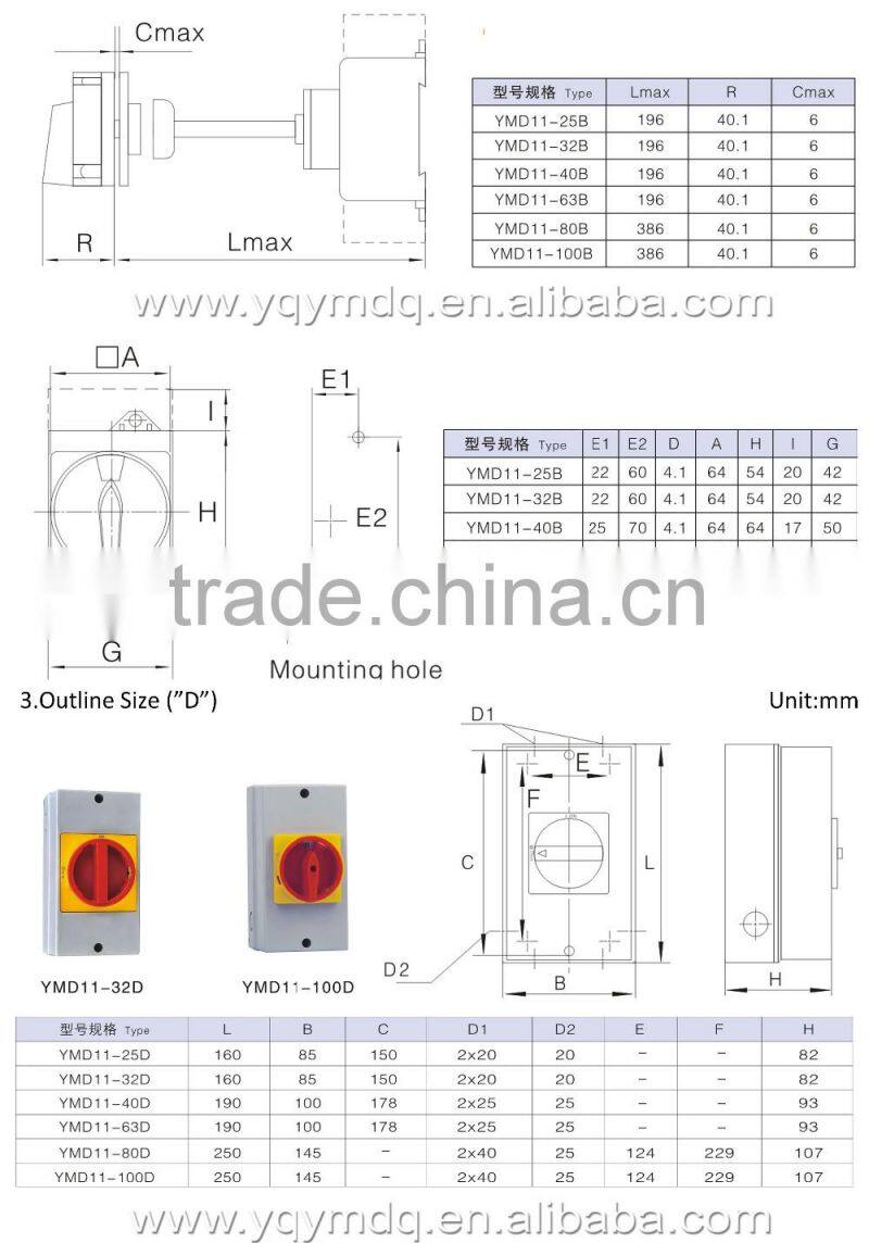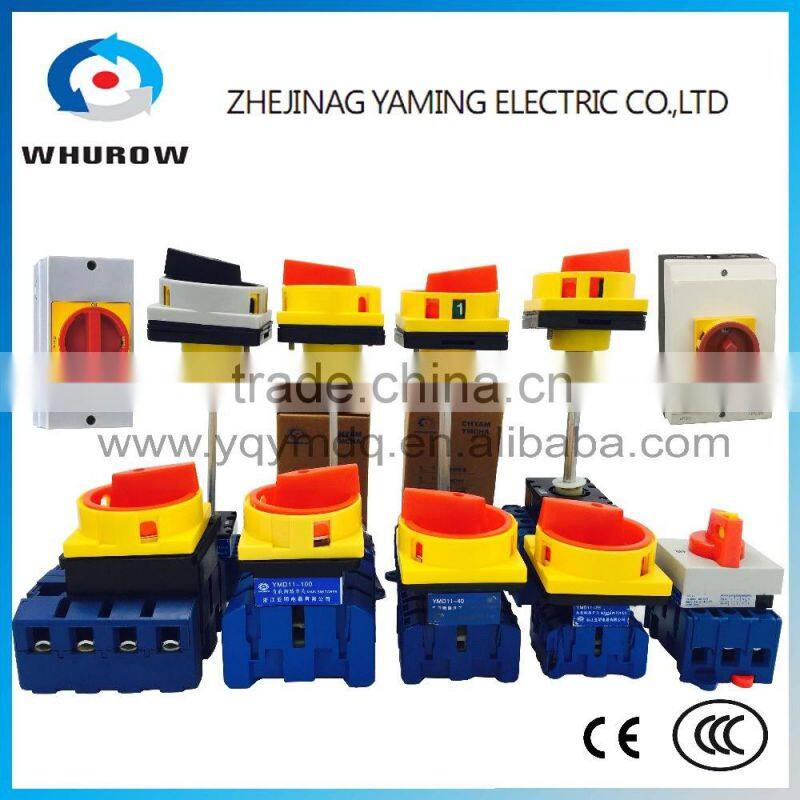 It is manual isolatoing switch, satisfy with isolation requitement,YMD11 control switch is used to ON/OFF control,urgent stop,complies with DIN VDE 0113,part 1,equivalent to foreign KG20-KG100 type main circuit switch,also complied with IEC947-3/DIN 0660(EN 60947-3) standards.