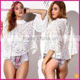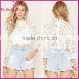 Fancy Solid Color Round Neck Flare Sleeve Ladies White Lace Blouse