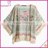 Three Quarter Length Sleeve Vintage Floral Tassel Fringe Kimono Cardigan Women