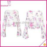 Ladies Crop Top White V-neck Floral Custom Printed Flared Long Sleeve Crop Top
