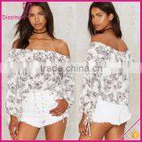 Ruffle Design off Shoulder Black Floral Print Ladies Long Sleeve Blouses Designs