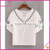 Short Sleeve White Lace Up Ldies Ethinic Mexican Embroidered Blouses