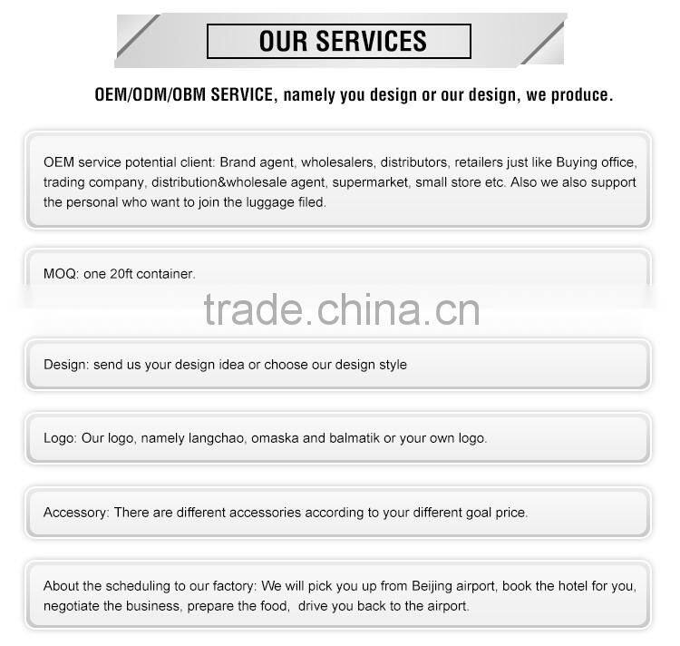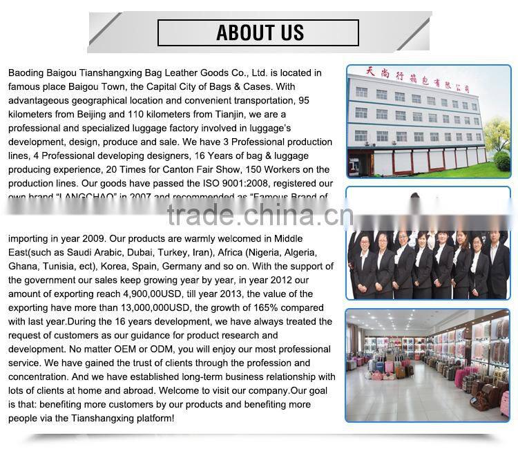 We are Tianshangxing luggage factory from China. Our brand is langchao. There are 16year's luggage producing experience and 6years' exporting experience. We has 2factorys, main factory produce fabric luggage and PU luggage, branch factory produce ABS+PC luggage. Our main product is Trolley luggage, suitcase, duffle bag. Our main market is Algeria, Saudi, Dubai, Poland, Canada, Korea, Japan and Malaysia etc.